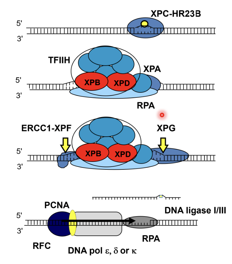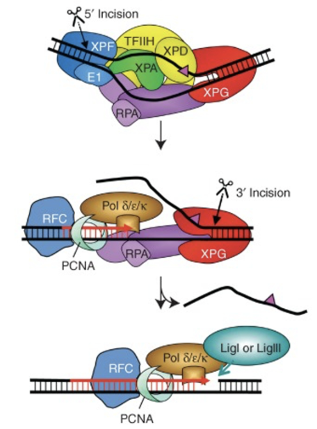 20-30nt stretch of DNA strand containing the damage is removed, leaving a gap which gets filled by DNA pol ε/δ/κ and PCNA (which is supported by RFC acting as a clamp loader) using the undamaged strand as a template