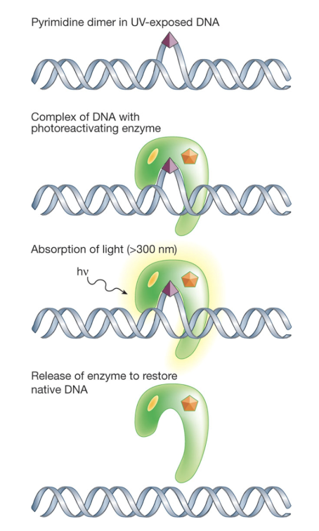 Breaks chemical bonds causing DNA damage and returns pyrimidines to original configuration