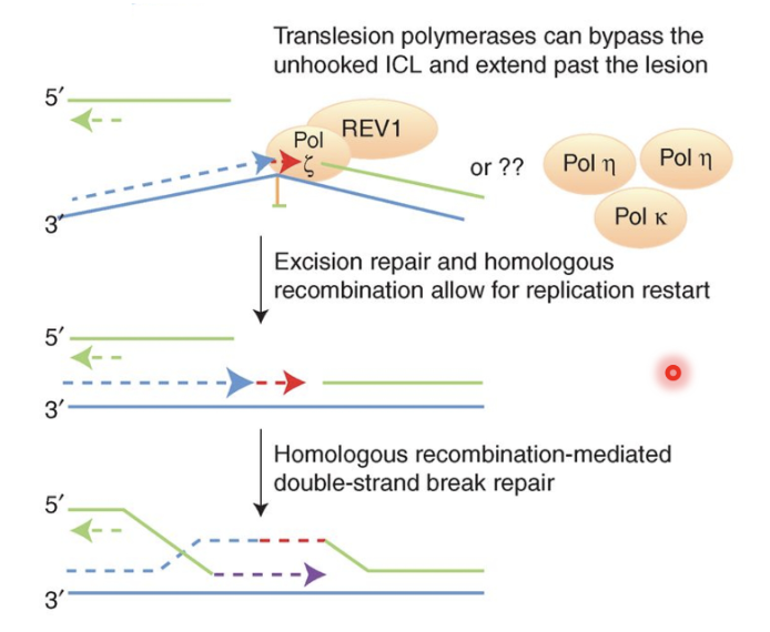 TLS polymerases take the stalled fork and extend it past the cross link in an error prone manner