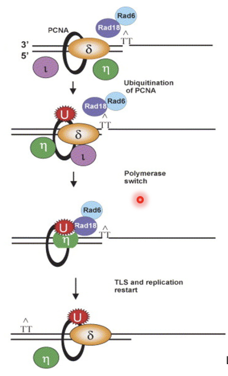 Causes recruitment of TLS pols (Pol ι and η) which continues extension and later switches back with replicative pol