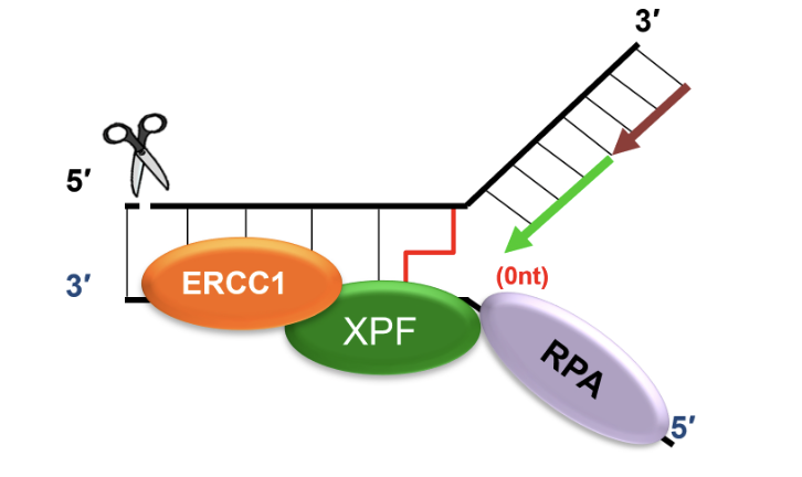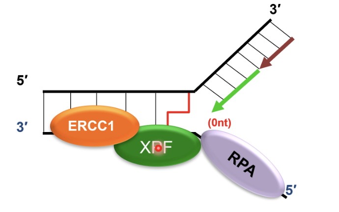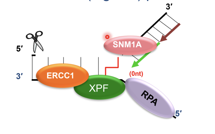 This is a damage tolerant 5’-to-3’ exonuclease that digests through and past the incised intermediate, leaving a single nucleotide and providing a downstream template for subsequent TLS complete repair of crosslink chromatid