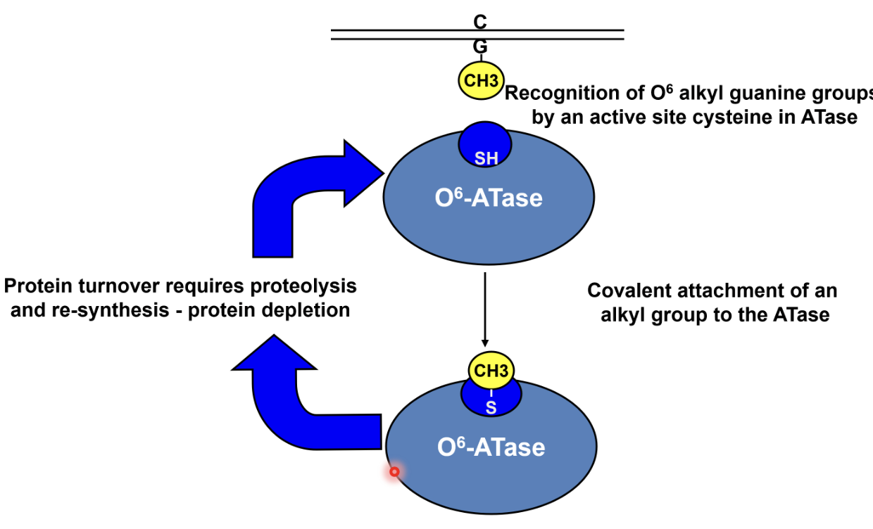 Temozolomide induces DNA methylation in the treatment of brain cancers, however cancer cells tend to upregulate this ATase as a resistance mechanism