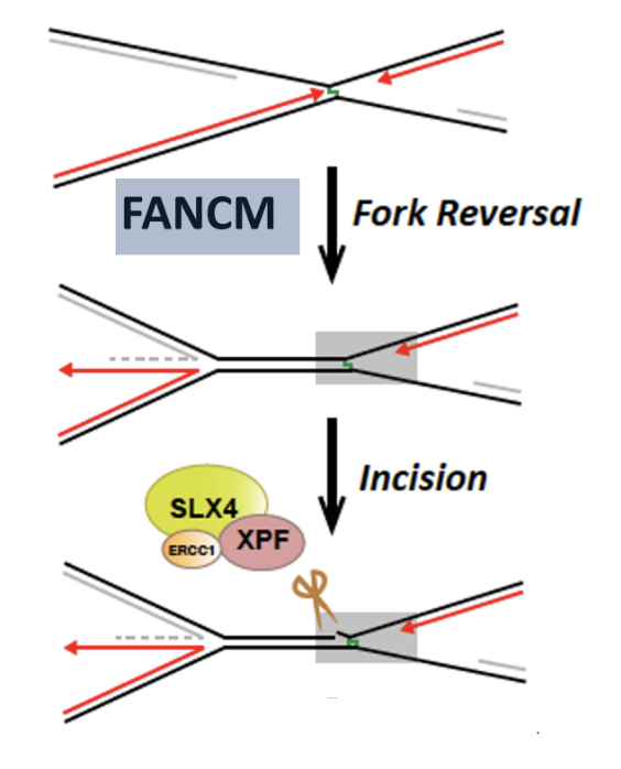 FANCM may function to rewind the DNA behind the stalled fork (fork reversal) which generates a region of dsDNA adjacent to the crosslink