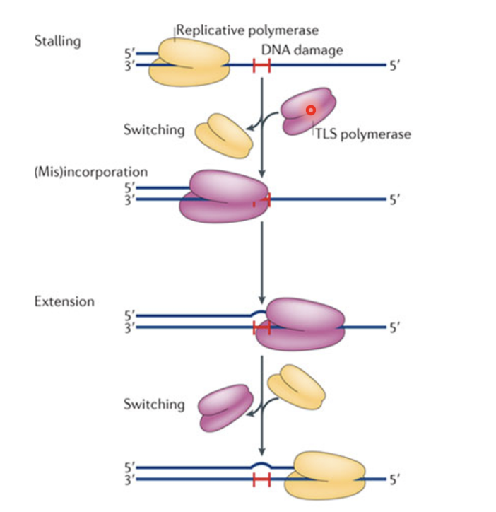 Replicative pol stalls and switches with TLS pol which can accomodate damage due to low processivity and continue extension, leading to mutation, they later switch back with the replicative pol after passing over the damaged region