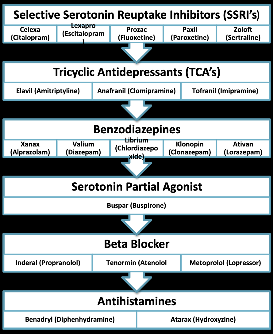 medication: benzodiazepines (episodic) → xanax for social phobias, beta blockers, SSRIs