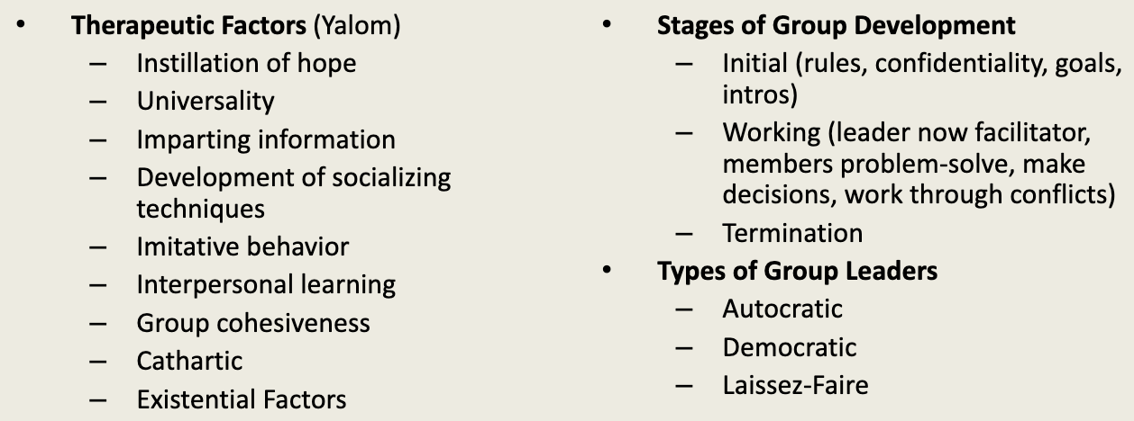behavioral: systematic desensitization → creation of graduate exposure to fear stimuli, encouraged to refrain from using avoidance response, implosion → bombarding or flooding the pt. with an exaggerated version of the phobic stimuli