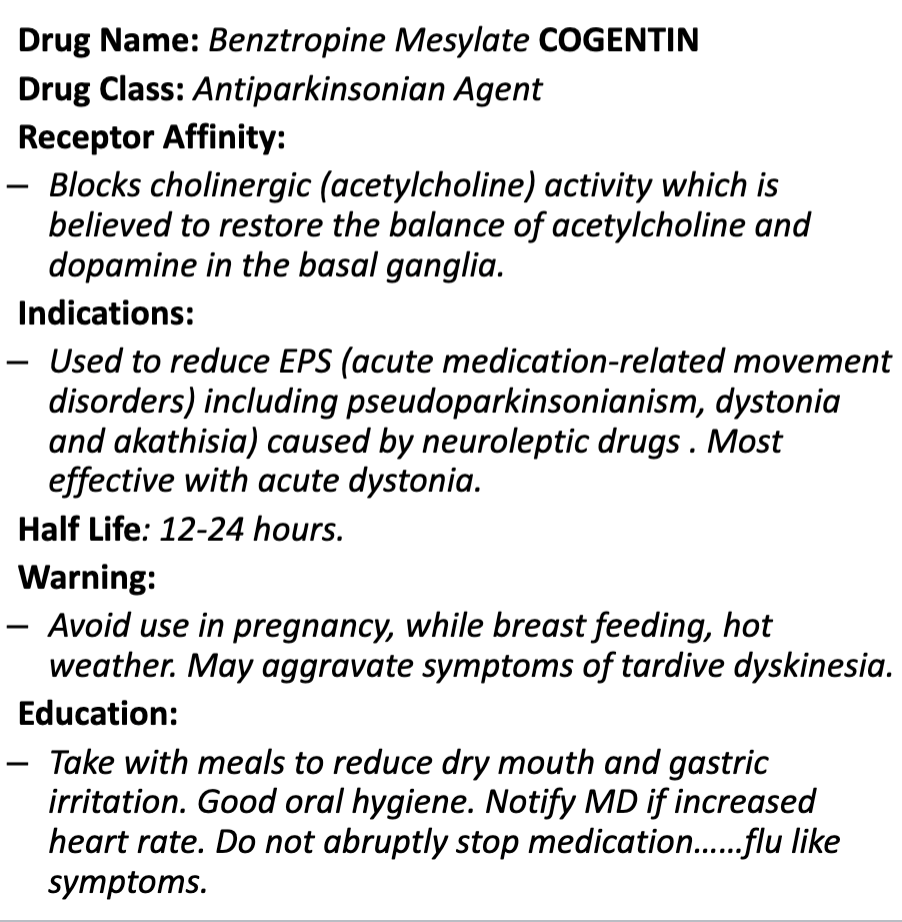 treatment: reduce antipsychotic medication, cogentin, benadryl, benzodiazepine, beta-blocker (comfort measures)