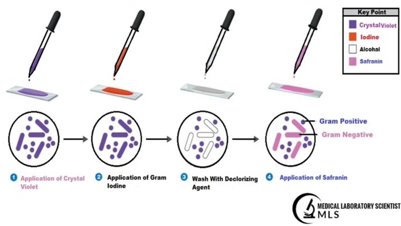 Cell effects - Gram-positive cells remain purple or blue. Gram-negative cells appear pink or red.