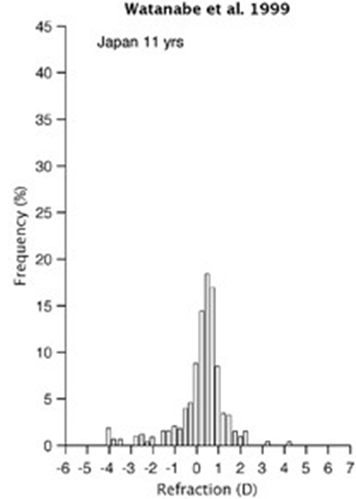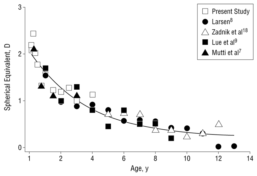 •By 3 years old the mean refractive error has shifted to around +0.75DS with a smaller standard deviation