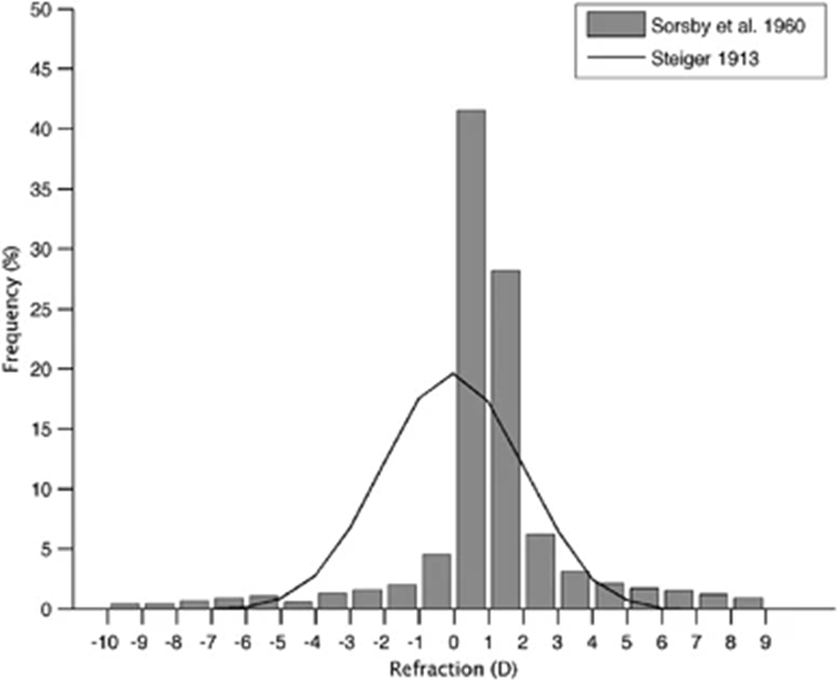 •At birth the distribution is largely gaussian (normally distributed) with a mean refractive error of around +2.00DS