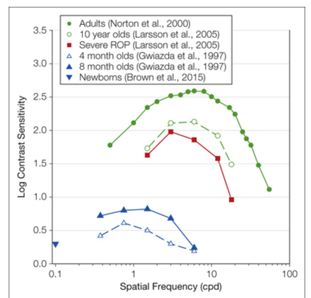 In childhood contrast sensitivity is reduced compared to an adult, particularly at mid and high SFs