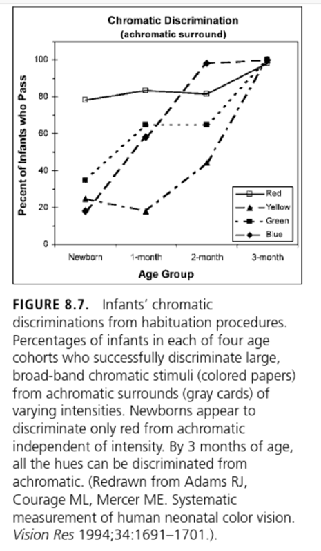 •Studies suggest that newborn babies can discriminate red, but other colours aren’t reliably seen until about 2-3 months of age - which is why young babies like looking at B&W patterns