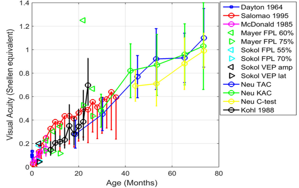 Our acuity steadily improves approaching adult levels by ~4-5 years