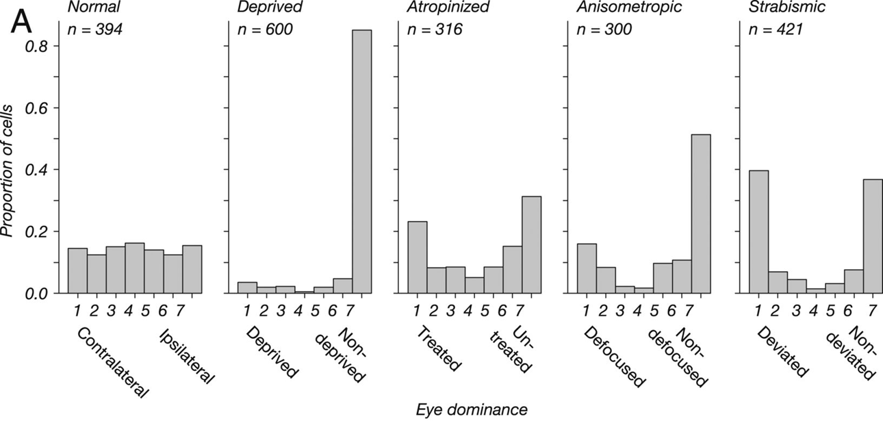 If an animal is deprived of sight in one eye from a young age (e.g. suturing the eyelid closed, or an occlusive contact lens) - the neurons undergo a change in function and begin to only respond to signals from the “good” eye (i.e. they are no longer binocular) - no longer any competition between 2 eyes and neurons for the other eye no longer develop