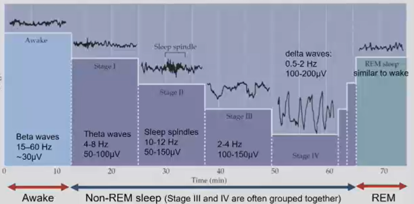 Starts with awake phase, with beta waves, then progressing through several non REM phases progressing from theta to delta waves