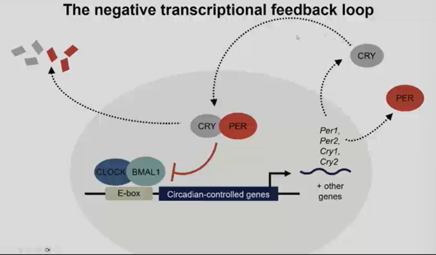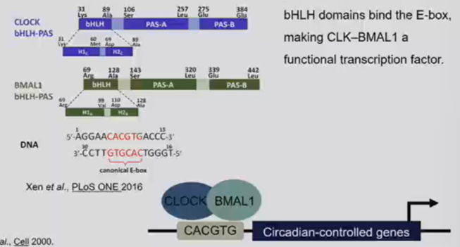 Clock and BMAL1 makes a dimer and recognises DNA sequences upstream of genes period, cryptochrome and other circadian controlled genes (up to 600)