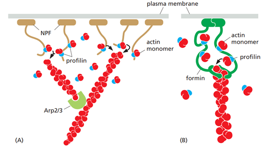Arp2/3 complex and formins are actin-nucleating proteins, meaning they help start new actin filaments, but they generate very different actin structures.