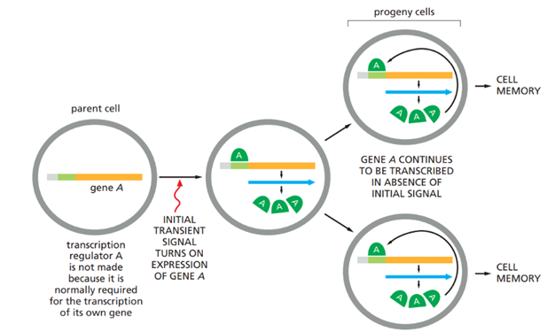 Cell memory is often initiated by an external signal that activates a master cell-type–specific transcription regulator. This regulator activates transcription of its own gene as well as other genes required to maintain the differentiated state, creating a positive feedback loop. After cell division, the transcription regulator is inherited by both daughter cells, where it continues to reinforce its own expression and that of downstream target genes. There are several other circuits that cells use to control gene expression. A negative feedback loop is often used to keep the concentration of a protein within a defined range. A low level/lack of repressors cause a higher gene expression, while high levels/active repressors cause a lower gene expression.