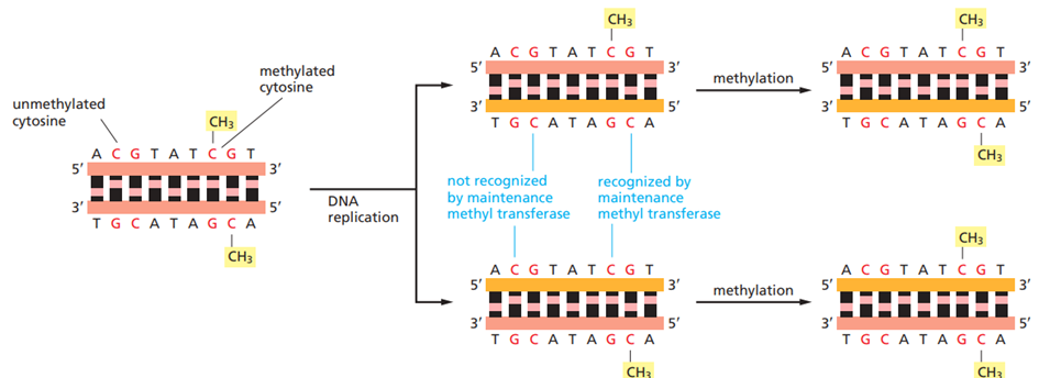 Cell memory is further reinforced by epigenetic mechanisms, particularly DNA methylation and chromatin modifications. In vertebrate cells, DNA methylation occurs mainly at CpG islands, and is associated with transcriptional repression. During replication, DNA methylation at CpG sites is copied onto newly synthesized DNA strands by maintenance methyltransferases, ensuring heritable gene repression. The whole point of methylation is to prevent the transcription of certain regions in the genome, as methylation blocks transcription factors from binding directly to the DNA.