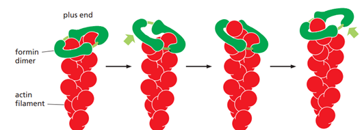 Formins nucleate unbranched, linear actin filaments. They form dimers that stabilize actin nuclei and stay associated with the growing plus end, allowing continuous elongation. Formins also associate with profilin.
