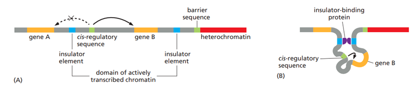 To avoid crosstalk between different control regions, several types of DNA elements compartmentalize the genome into discrete regulatory domains. Insulators prevent cis-regulatory sequences (activators and repressors) from activating/repressing inappropriate genes by forming loops, keeping a gene and its control region in rough proximity, and helping to prevent the control region from “spilling over” to adjacent genes.