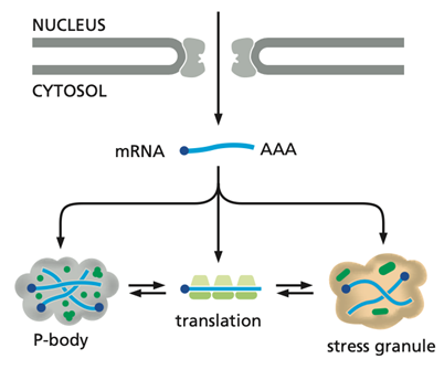 RNA transport and localization control – control of when and where the mRNA is transported from the nucleus to the cytosol and where it is localized in the cell.