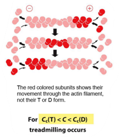 Intermediate actin concentration → T-tip at plus end and D-tip at minus end → treadmilling