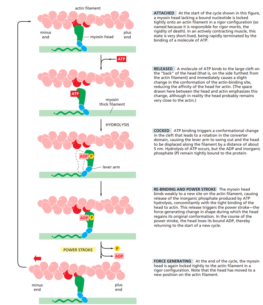 Next, the myosin head rebinds to a new position on the actin filament closer to the plus end. Release of phosphate triggers the power stroke, during which the myosin lever arm swings and pulls the actin filament relative to the myosin. Finally, ADP is released, leaving myosin tightly bound to actin until a new ATP binds and the cycle repeats.