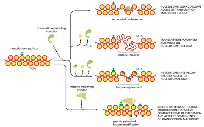 These include histone-modifying enzymes, ATP-dependent chromatin-remodelling complexes, and histone chaperones. Together, they remodel nucleosomes by sliding them along DNA, removing them, or replacing standard histones with histone variants, which increases DNA accessibility.