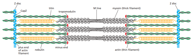 Nebulin, a large actin binding protein, stabilizes actin filaments along their length, acting as a molecular ruler, and stretches from the Z-disc to the actin filament minus end. Titin, a gigantic protein, extends from the Z-disc to the M-line, and a keeps thick filaments centered, pushing them towards the center, as if it was a spring.