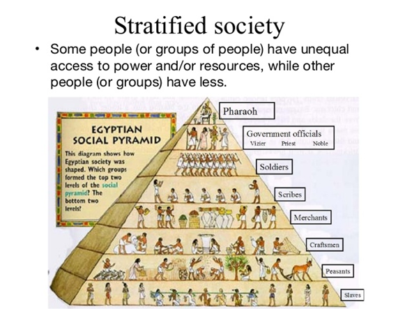 •Stratified societies: Unequal access to resources. Access is tied to prestige. Stratified societies are characterized by a growth of exploitation, strong specialization, demands on labor, and institutional slavery.