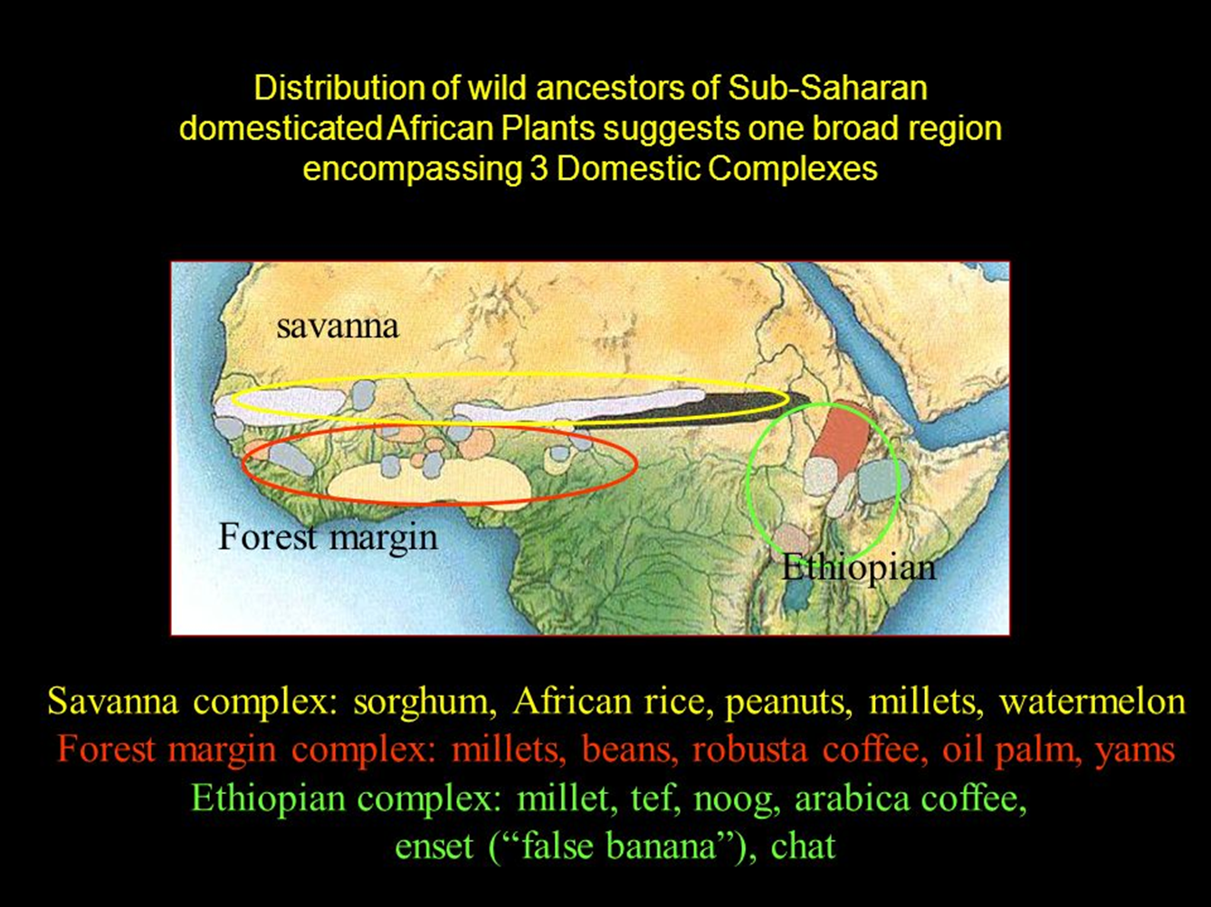 Northeast Africa, teff and finger millet, and coffee were domesticated. Timing and process of plant domestication are poorly understood.