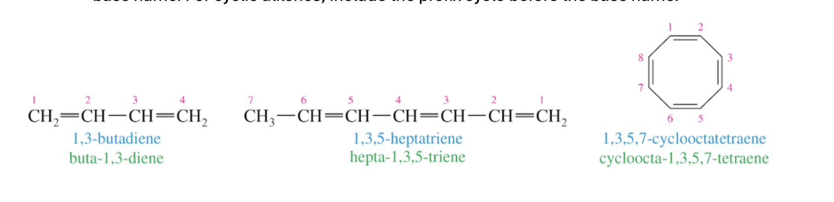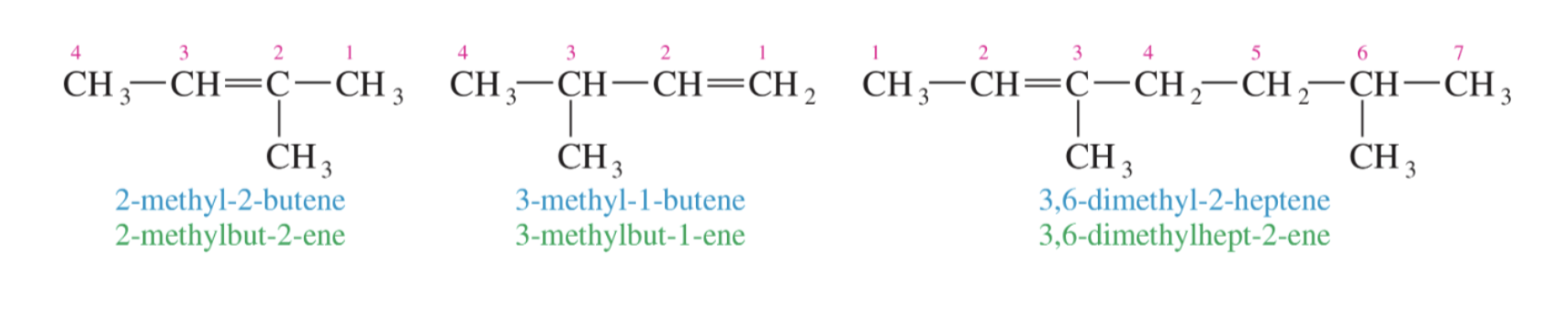 4. If multiple alkenes are present, like how we treat multiple of the same substituent, include the carbon numbers for both alkenes and use the prefix “di” or “tri” etc. in the base name. For cyclic alkenes, include the prefix cyclo before the base name.
