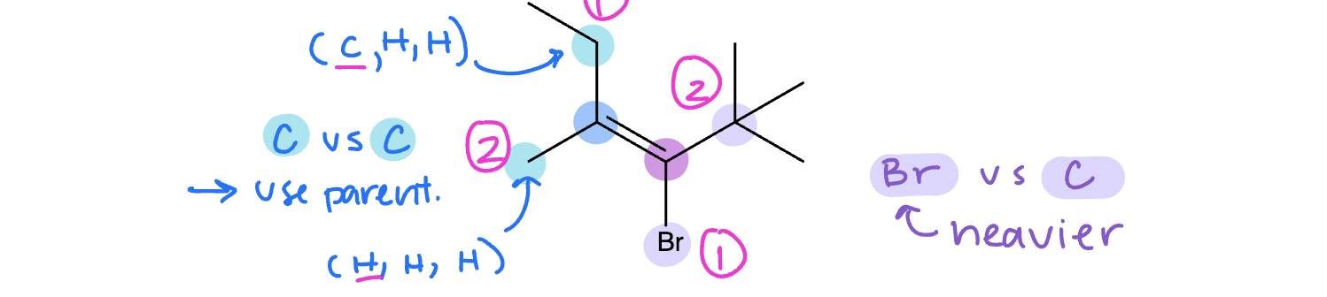 Step 1: Rank the groups attached to the same alkene carbon in priority (1 = higher priority and 2 = lower priority) using the exact same IUPAC priority rules that we used to determine whether a stereocenter was R or S