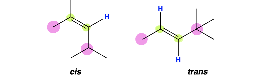 Cis/Trans: Simple alkenes (only one R group per alkene carbon) that contain a hydrogen atom directly attached to each alkene carbon are often classified using cis/trans. However, this designation becomes less clear when multiple carbon groups are attached to the same alkene carbon.