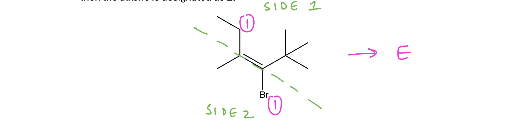 If the number 1 groups are on opposite sides of the alkene (trans type relationship) then the alkene is designated as E