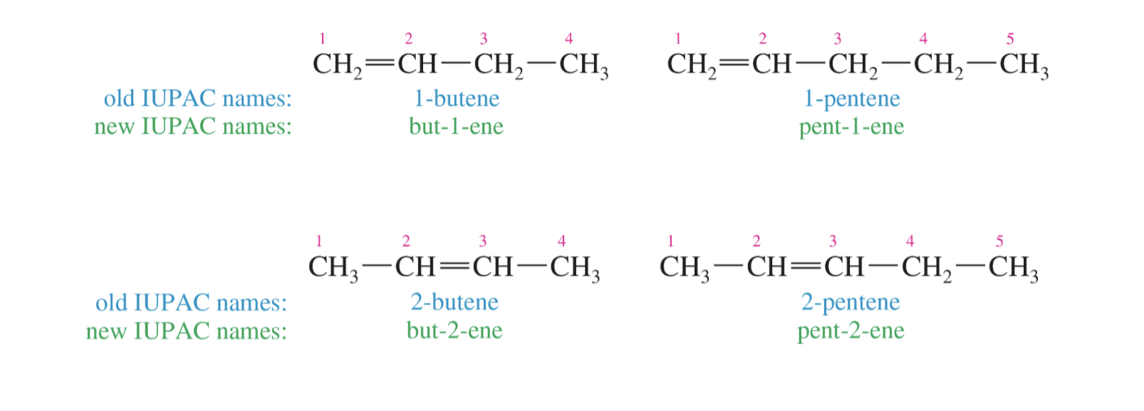 New (use this one): carbon number prefix - number of the first alkene carbon - ene Old (just so you are aware): number of the first alkene carbon – carbon number prefix + ene