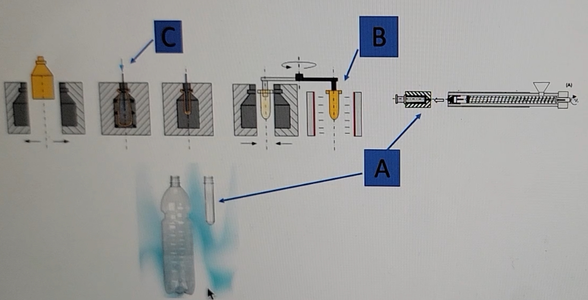 Upper part of B: air is blown into the tubing causing it to expand filling the mold cavity.