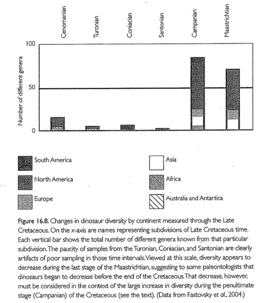 Cretaceous: Faunal divergence between Laurasia and Gondwana; hadrosaurs and ceratopsians in Laurasia, titanosaurs in Gondwana.