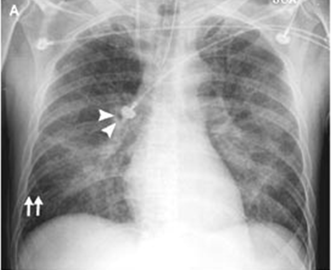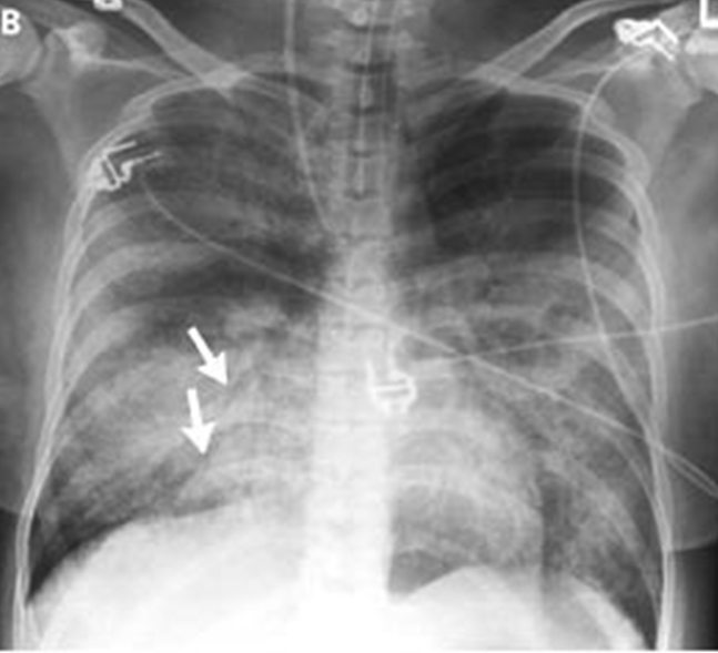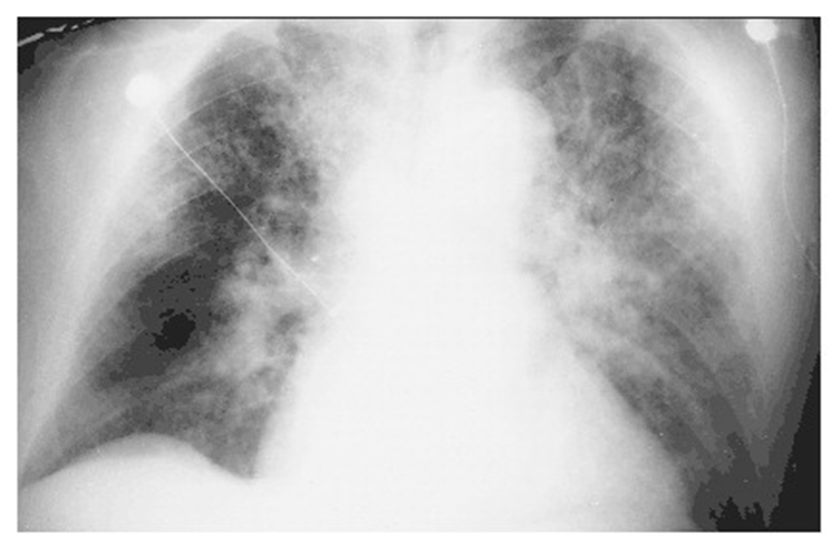 A 22-year-old woman whose blood culture was positive for Streptococcus pneumoniae, causing pneumonia complicated by septic shock and acute respiratory distress syndrome. Diffuse alveolar infiltrates appear patchy and bilateral with air bronchograms