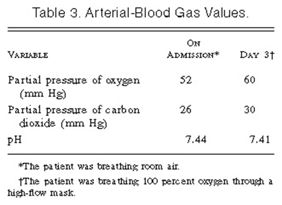 The temperature was 36.9°C, the pulse was 88, and the respirations were 26. The blood pressure was 130/90 mm Hg. The physical examination revealed a pale, obese man propped up in bed who had dyspnea while breathing oxygen at 5 liters per minute.