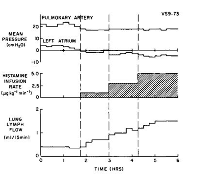 Lung lymph flow is measured under different conditions. Closed symbols represent experimental subjects, and open symbols represent control subjects. Each line is indicative of lung lymph flow in a single subject. Which of the following would best explain the lymph response depicted by the attached graph?