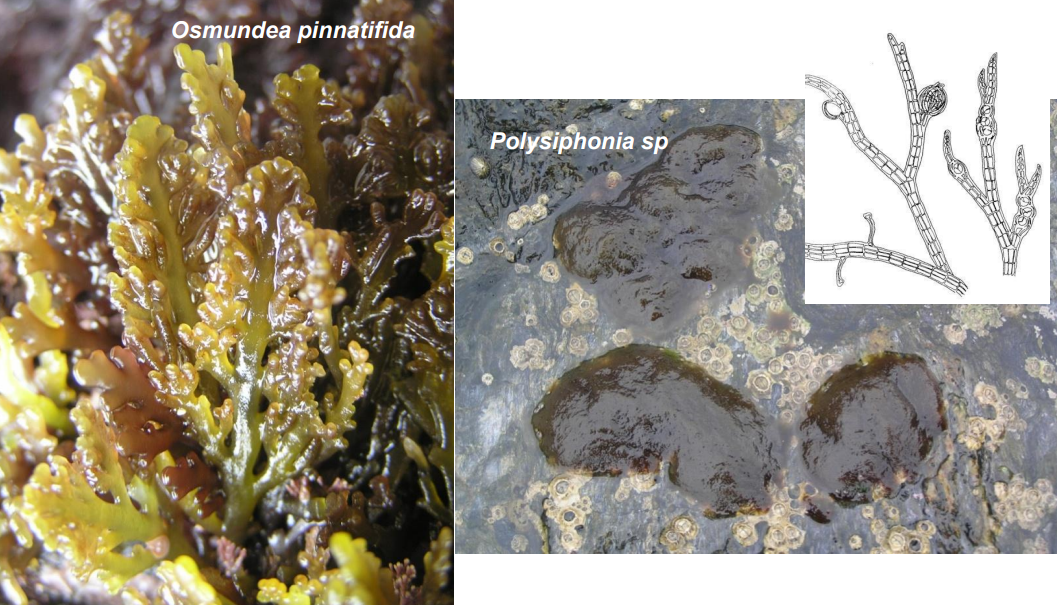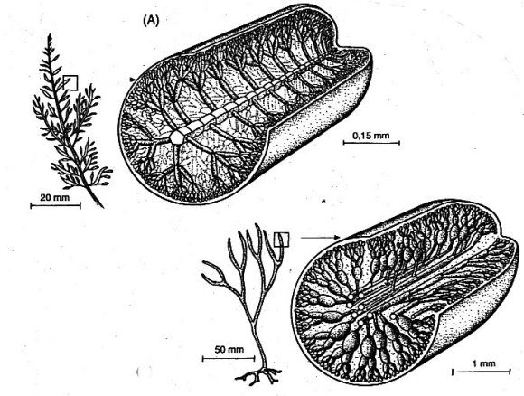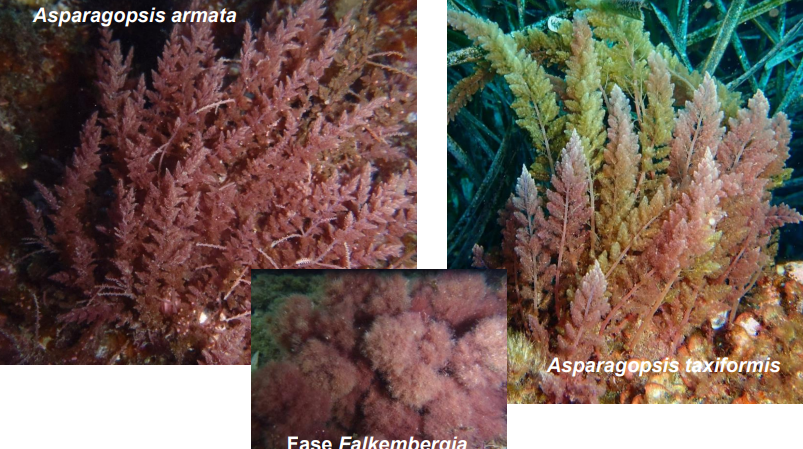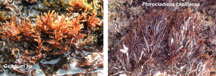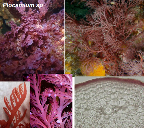 Talos laminares (Rissoella sp.), talos ejes aplastados (Sphaerococsus sp).