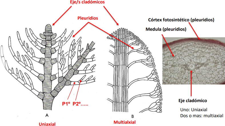 Si se hace un corte en el centro se encuentra la célula axial, de pared más gruesa, que forma el eje cladómico. A su alrededor encontramos pleuridios, que disminuyen en diámetro hasta el exterior.