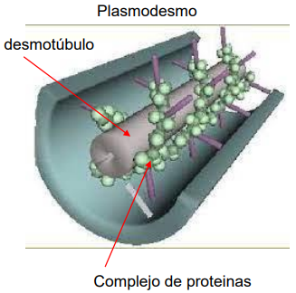 Dentro de la pared celular podemos encontrar plasmodesmos. Complejos que conectan las células a través de la pared celular, permitiendo el transvase de metabolitos. Además tienen función estructural (da resistencia).