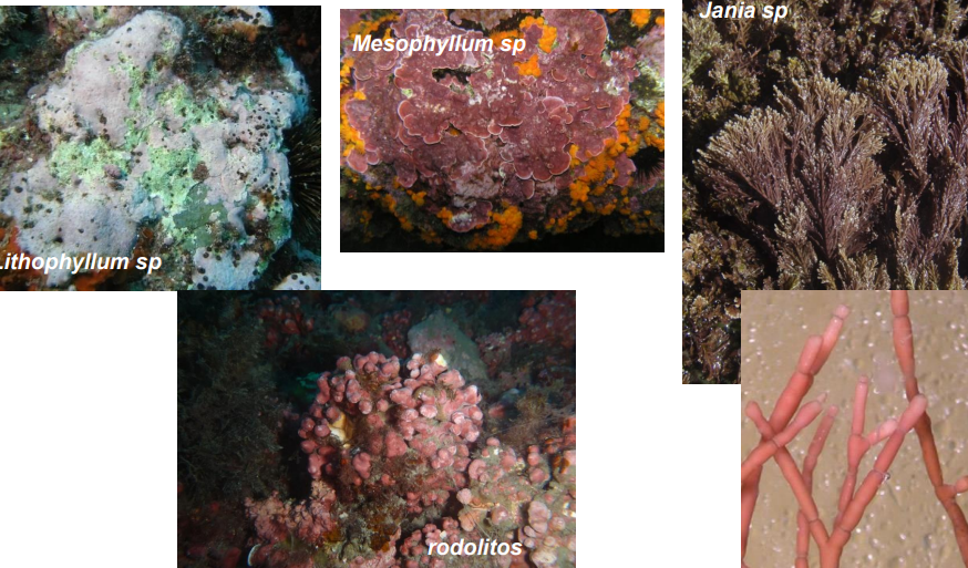 Importancia de las algas coralináceas con estructuras calcáreas como sumideros de CO2. Utilizadas por otras algas como soporte.