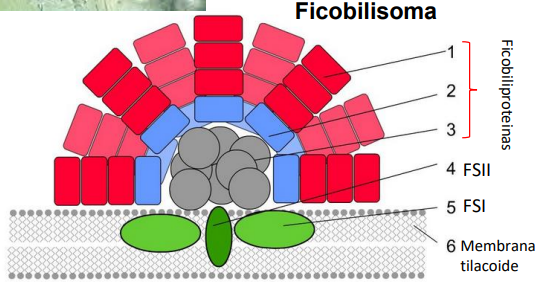 Ficobiliproteinas en ficobilisomas (ficoeritrinas y fiococianinas). Asociados a la membrana tilacoidal formando el complejo de antena.