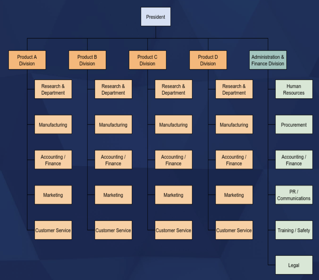 Combines elements from different traditional organizational structures, most typically mixing aspects of both functional and divisional structures and therefore allowing for more flexibilities in adapting to the specific needs of each business or