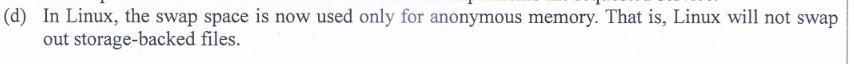 Anonymous Memory為沒有對應檔案的資料,如程式動態分配的記憶體(Heap),而storage-backed file有對應的檔案,因為可隨時重新讀取,所以除非該page是dirty的,不然不需要swap-back => True