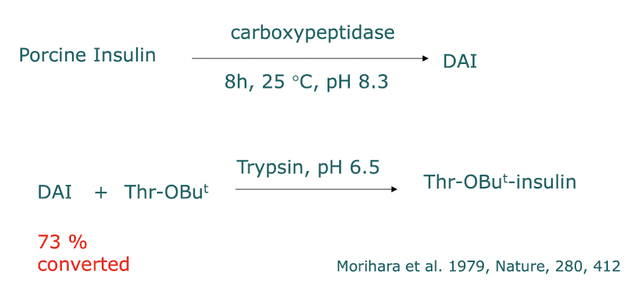 Performing semi-synthesis → done via Trypsin, a reversible protease, we want to cleave the Ala from the SC → DAI (d-Ala insulin)